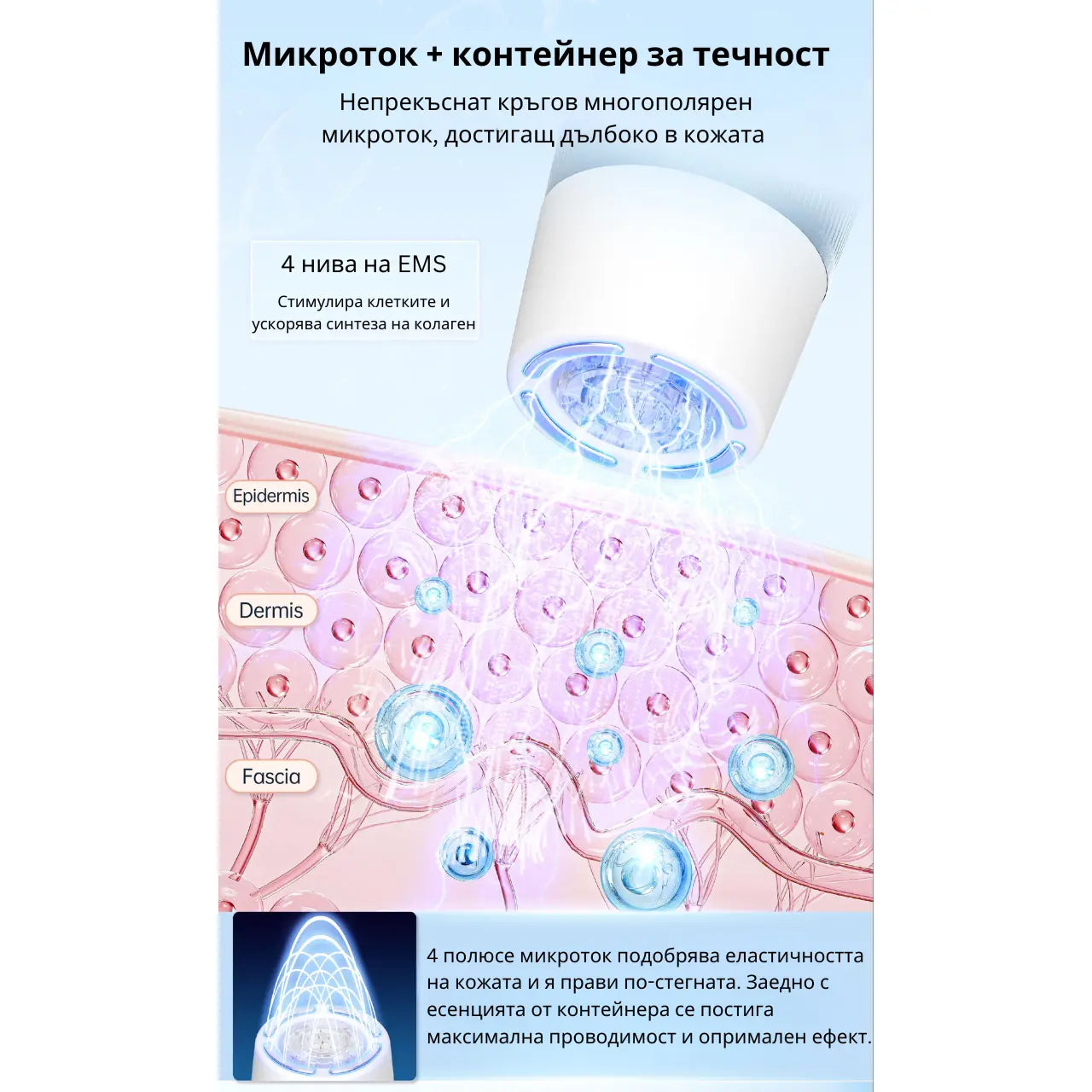 - Автоматично вливане на серум: 3 мл касета с регулируем поток (3 нива) за равномерно абсорбиране на козметика по време на процедурата.